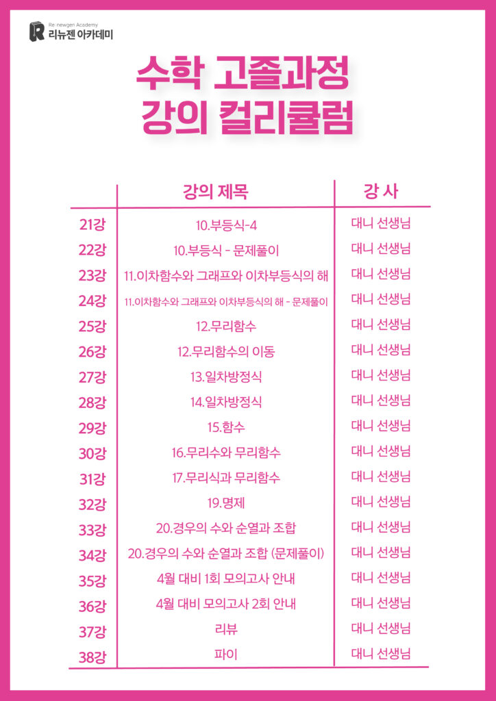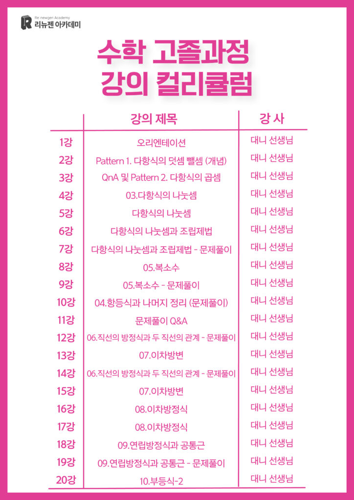 리뉴젠 아카데미 고졸 검정고시 수학 교재입니다 교재는 개별구매하시면 됩니다